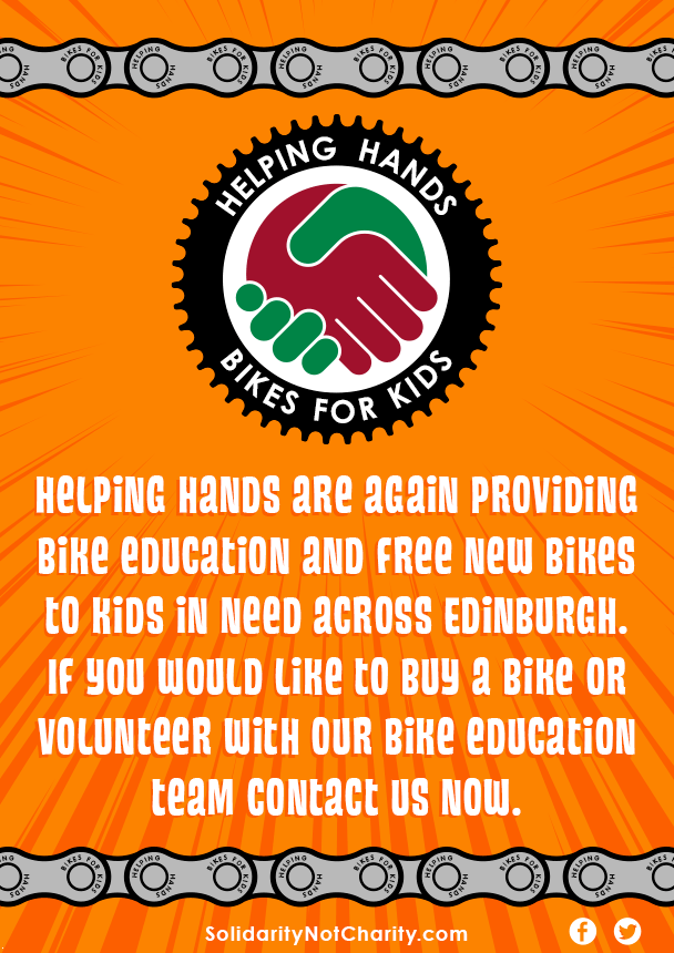 This year Helping Hands have topped 1000 new bikes distributed to young people in working class communities across Edinburgh. Breaking down geographic, social and economic barriers. Encouraging Fitness, Freedom and Fun.